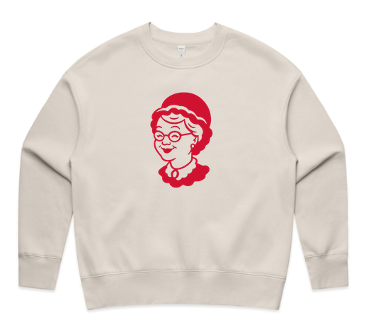 Our BRAND NEW Mrs. Claus front and center in a true holiday red on putty colored sweatshirt.